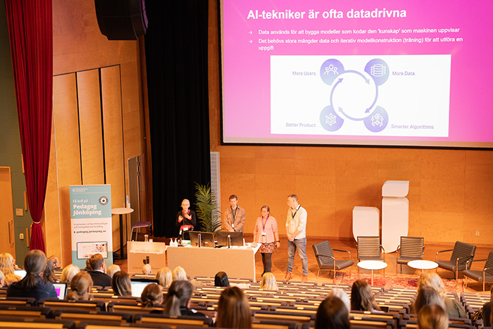Learning and competences in change in a post-digital era - AI in focus was the item on the agenda after the coffee break. The speakers were Ylva Lindberg, Professor of Pedagogy, specializing in language and literature didactics at HLK, Maria Bäcke, Senior lecturer in literature, also at HLK, Joel Rangsjö, AI business developer, Jönköping municipality's education administration, and Andrew Galbraith, First teacher in AI, Erik Dahlbergsgymnasiet in Jönköping, who talked about how AI can be used for educational purposes.