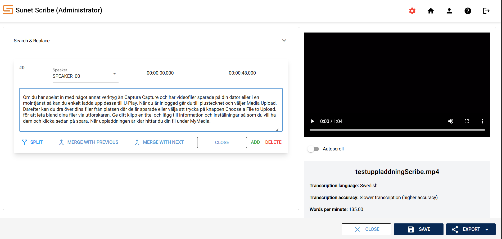 Har du gjort en transkribering så ser du texten som en helhet, utan uppdelning på olika tider.