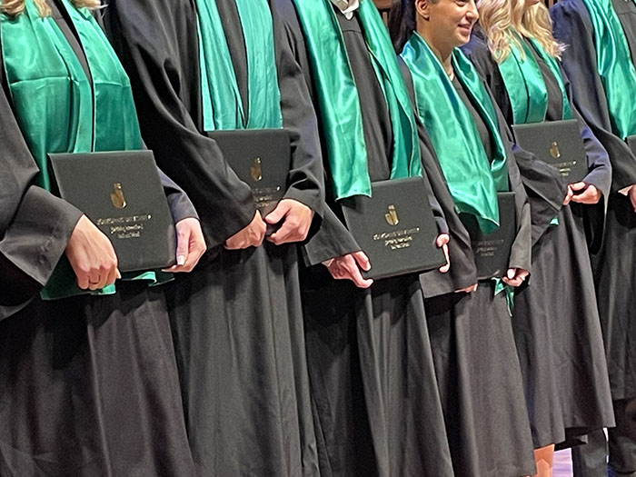 Jönköping University (JU) examinerade i år cirka 1 800 studenter. De fyra fackhögskolorna HHJ, HLK, JIBS och JTH har sina egna avslutningshögtider för studenterna som tar sin examen. Då pandemin har stoppat fysiska avslutningshögtider de senaste två åren var det nu festlig, glädjefull och uppslupen stämning bland alla glada studenter och stolta familjer och vänner i publiken.
