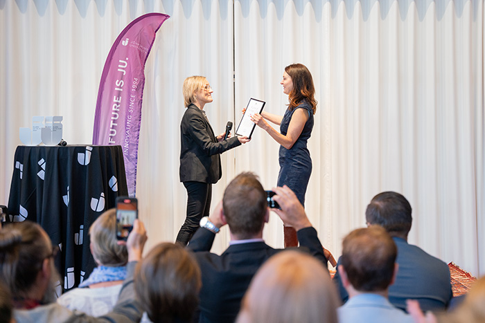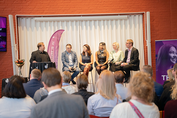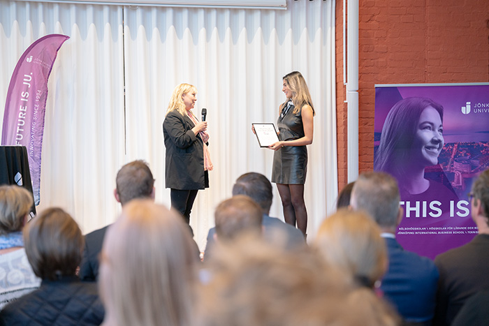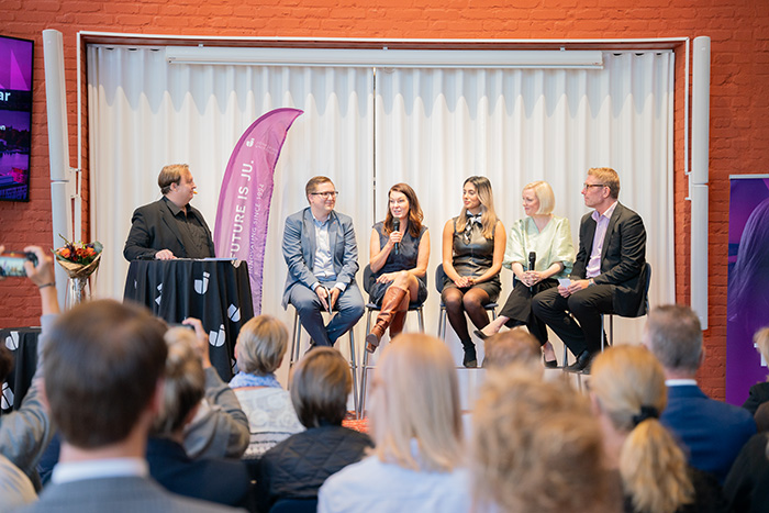 Efter prisceremonin höll Andreas Torén, enhetschef Studentstöd, ett inspirerande panelsamtal med pristagarna. En av frågorna handlade om vad alumnerna tyckte var det viktigaste de lärde sig under sin studietid på JU.