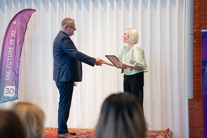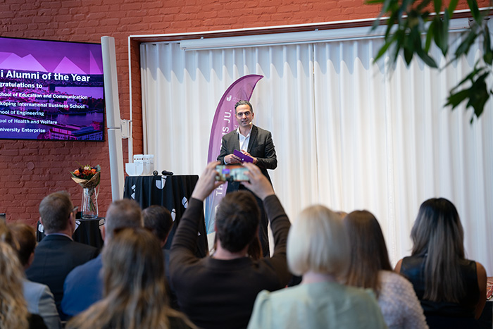 – Ceremonin blev mycket framgångsrik, livlig och inspirerande. Alumnerna, med sina varierande akademiska bakgrunder och karriärer, arbetar nu inom olika sektorer och är på olika sätt fortfarande knutna till sina fackhögskolor. Paneldiskussionen, ledd av Andreas Torén, var både engagerande och lärande. Det var imponerande att få höra deras berättelser och lärdomar från studietiden, särskilt hur utbildningen vid JU har hjälpt dem att lyckas i arbetslivet och inspirerat några till vidare studier vid JU. Ceremonin gav också alumnerna en utmärkt möjlighet att träffas och utbyta erfarenheter. Att främja sådana evenemang är viktigt för nätverkandet, då JU ser alumnerna som viktiga förebilder för både nuvarande och framtida studenter samt för näringslivet, säger Salem Seifeddine som även vill rikta ett stort tack till Alumni nätverket vid JU och publiken som gjorde eventet så lyckad.