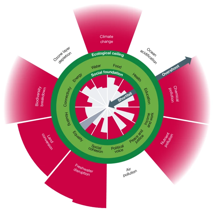 En modell som används för att illustrera hur de miljömässiga förutsättningarna är kombinerade med en social grund är Doughnut Economy. Bilden är baserad på idén om planetära gränser och på de globala målen.