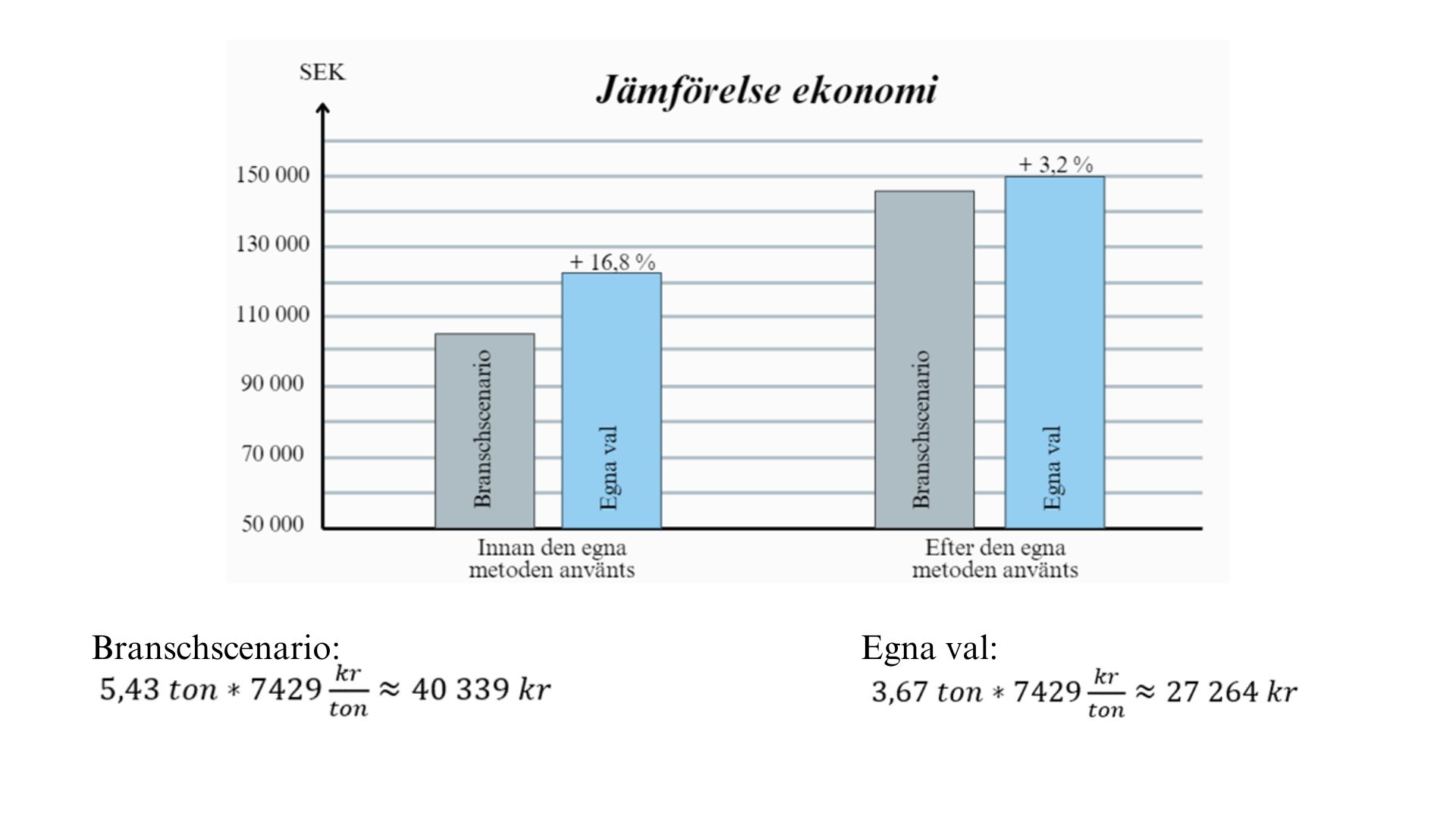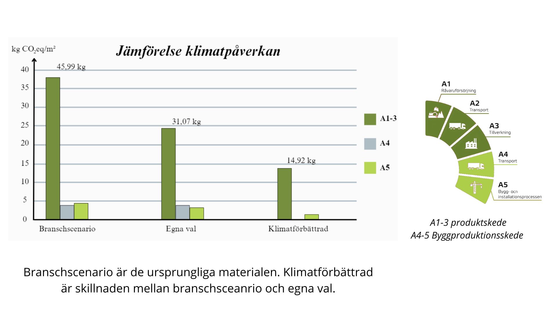 I studien har en klimatdeklaration med schablonvärden från Boverket gjorts med material utifrån ett fallobjekt. Sedan jämfördes EPD:er för att hitta likvärdiga material med lägre klimatpåverkan. Efter att materialen bytts ut gjordes en ny klimatdeklaration för att kunna jämföra utsläppen. Även en ekonomisk jämförelse gjordes med genomsnittspriser från en byggvaruhandel i det geografiskt avgränsade området, Götaland. Tidigare forskning har tagit fram en kostnad för ett ton koldioxidutsläpp, 7 429 kr. Med hjälp av denna kostnad möjliggjordes en ekonomisk jämförelse av klimatpåverkan.